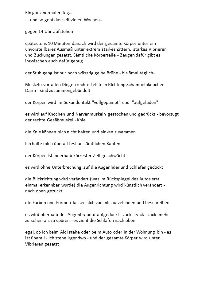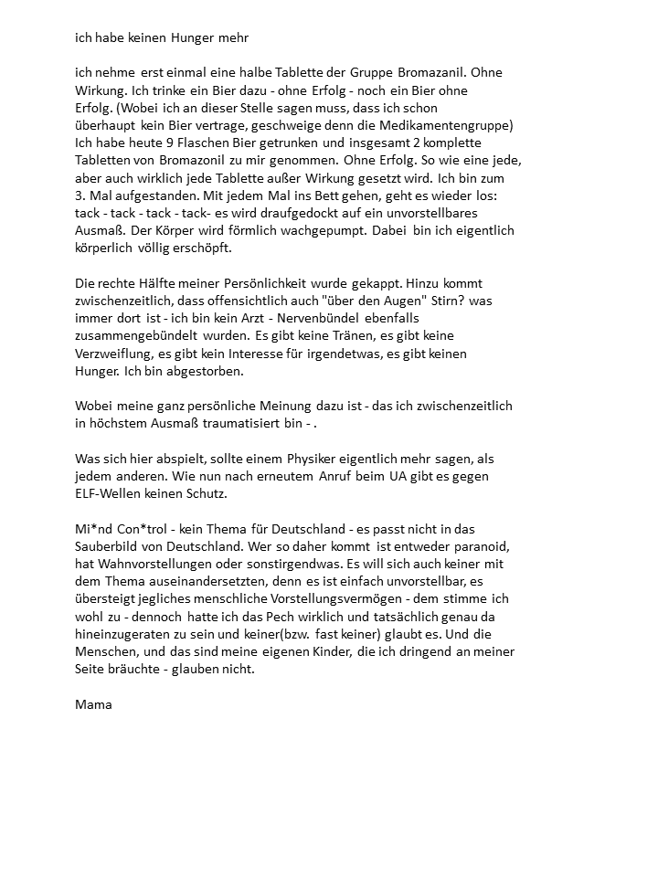Es mag unpassend sein, und vielleicht auch falsche Offenheit, aber ich lade mal als pdf eine Mail hoch von ihr. Solche bekommen wir fast täglich. Seit knapp 2 Jahren. Sie ändern sich nur in den Syptomen, die immer krasser werden. Und die Länge variiert. Diese ist recht kurz, für das was wir gewohnt sind.